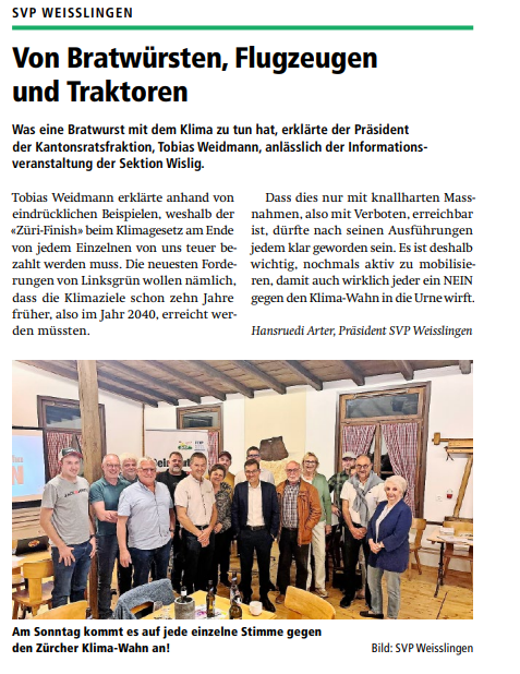 Was eine Bratwurst mit dem Klima zu tun hat, erklärte der Präsident der Kantonsratsfraktion, Tobias Weidmann, anlässlich der Informationsveranstaltung der Sektion Wislig. Artikel lesen